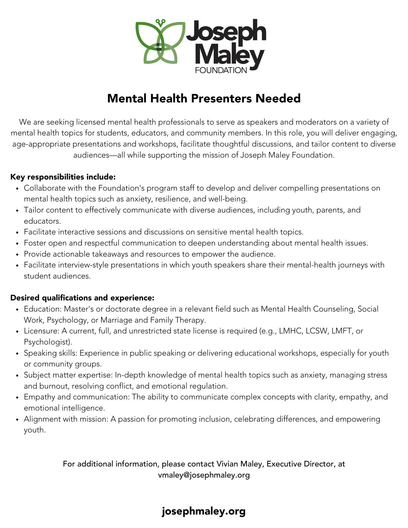 We are currently seeking licensed mental health professionals to serve as speakers and moderators on a variety of mental health topics for students, educators, and community members. In this role, you will deliver engaging, age-appropriate presentations and workshops, facilitate thoughtful discussions, and tailor content to diverse audiences. For more information, please review the full description of this role HERE.
