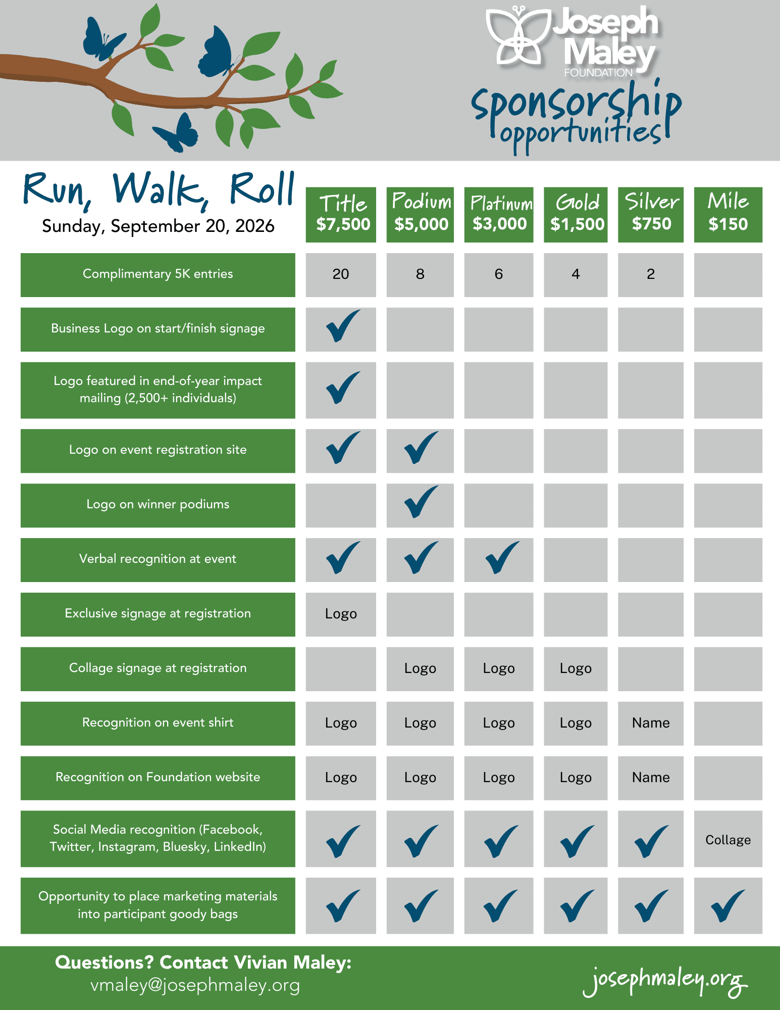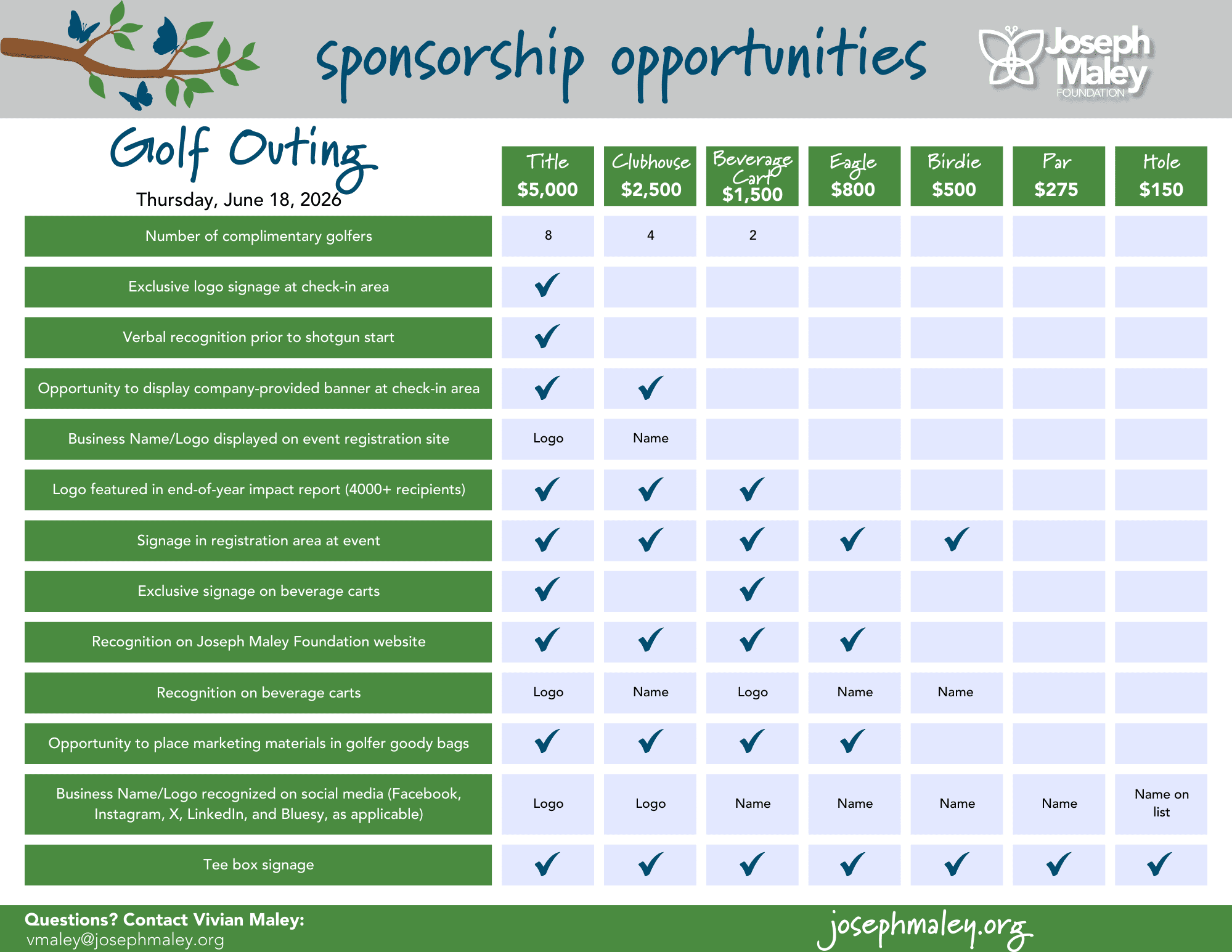 For more information about sponsorship levels for events and programs, please contact Executive Director, Vivian Maley at vmaley@josephmaley.org.